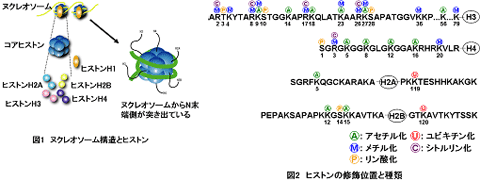 ヒストンはDNAを折りたたんでクロマチン構造にする主要なタンパク質です。強い塩基性のタンパク質であり、酸性のDNAと高い親和性を示します。主に5 種類のヒストン(H1、H2A、H2B、H3、H4)が存在し、このうちH2A、H2B、H3、H4はコアヒストンと呼ばれ、それぞれ2分子が集まり八量体を形成しています(図1)。このコアヒストンのN末端側がヌクレオソームから突き出ており、数々の翻訳後修飾を受けることが知られています(図2)。これらのヒストンの修飾はDNAとの親和性を変化させたり、修飾体を認識するタンパク質と相互作用をすることにより遺伝子発現を調節していると考えられています。